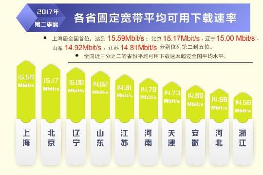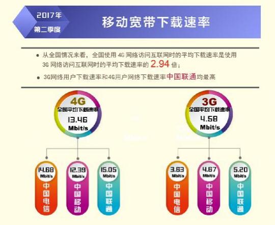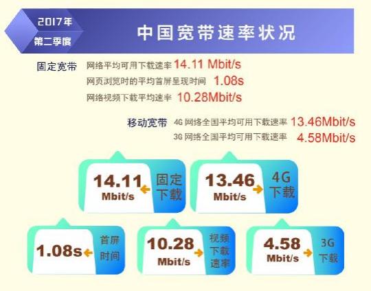 日前,寬帶發(fā)展聯(lián)盟發(fā)布了第 16 期《中國寬帶速率狀況報告》(2017 年第二季度)。報告顯示 2017 年第二季度我國固定寬帶網絡平均下載速率達到 14.11Mbit/s,比 2017 年第一季度提高了1.1Mbit/s,同比去年第一季度提升了 34.8%。自 2015 網絡“提速降費”工作開展以來,我國固定寬帶可用下載速率連續(xù) 10 個季度持續(xù)提升,總提升幅度達到 3.3 倍。同時,我國移動寬帶用戶使用 4G 網絡訪問互聯(lián)網時的平均下載速率達到 13.46Mbit/s,環(huán)比 2017 年第一季度也有 14.2%的提升。